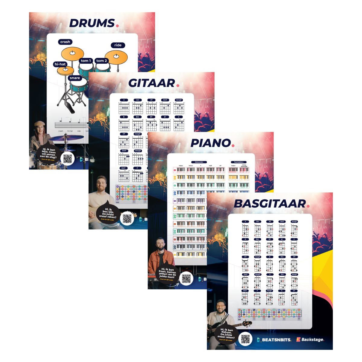 De set bestaat uit vier posters: drums, gitaar, piano en basgitaar. Ze geven leerlingen visueel referentie tijdens het beoefenen van een instrument. Scannen ze de QR-code op de poster, dan komen ze terecht bij een videotutorial voor dat specifieke instrument. Klinkt het als muziek in de oren? Laat dan hier je gegevens achter! *